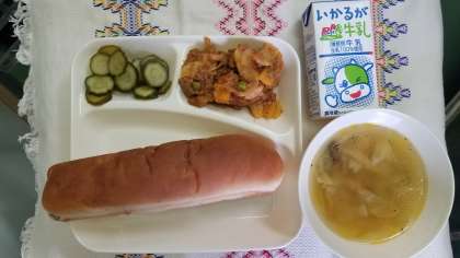 本日の献立は、じゃがいものミートグラタン、スープ、きゅうりのピクルス、レーズンパン、牛乳です。