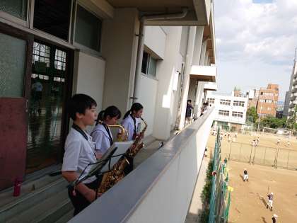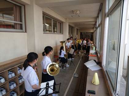 吹奏楽部は、ベランダや廊下にわかれてのパート練習です。いろんな曲が校内に響いていますね。