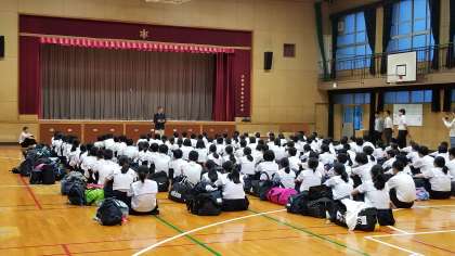 帰校式を体育館で行います。保護者のみなさまもお迎えありがとうございました。