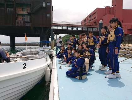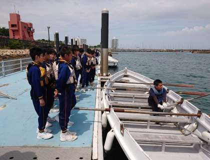 櫂(かい)のレクチャーを受けています。いよいよ乗船します。