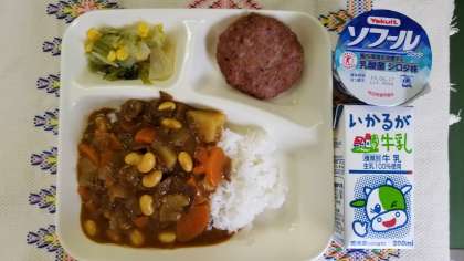 本日の献立は、牛肉と大豆のカレーライス、焼きハンバーグ、レタスとコーンのサラダ、ヨーグルト、牛乳です。