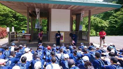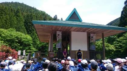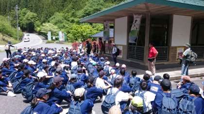 観音峯登山口の駐車場で入村式を行いました。桝源旅館の女将さんにご挨拶です。
