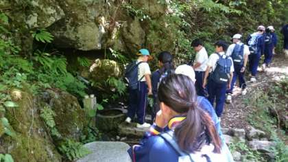 入村式が終わり、いよいよ登山開始です。約1時間少しの行程ですが、けっこうキツイ登りが続きます。途中美味しそうな湧水がありました。