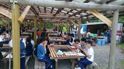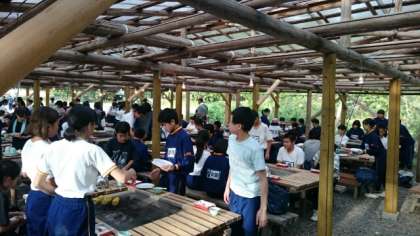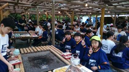 食事係の皆さんの合図で「いただきます!」 旅館の方々が用意してくださったバーベキュー。いっぱい食べてね。