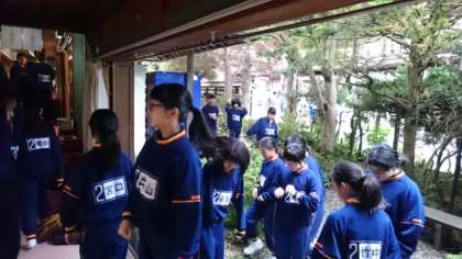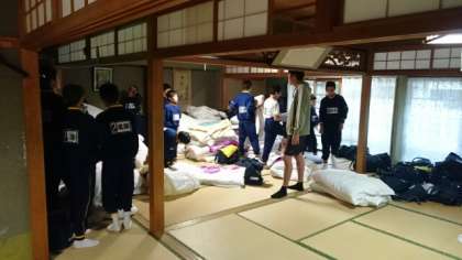 起床後、みんなで協力してお布団のお片付け。荷物の整理を済ませ、朝食をいただきます。別館の大広間に、本館から女子もやってきました。間もなく朝食時間です。