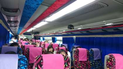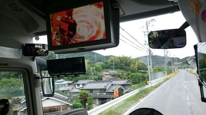 帰りの車内では、ビデオを上映していただいています。皆さん、おしゃべりを中断して見いってます。