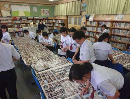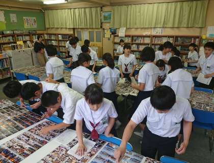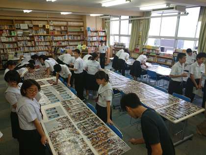楽しかった修学旅行を写真を見ながら振り返ります。図書室は、思い出話に包まれます。たくさんの写真があり、見る時間が足りないくらいでした。写真を申し込みは、6月3日(月)・4日(火)です。
