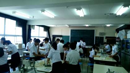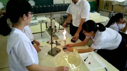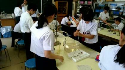 2年生理科の授業で「物質を加熱したときの変化」について学習しています。「炭酸水素ナトリウム」を加熱すると、炭酸ナトリウム・二酸化炭素・水に分解されるのですが、実際にバーナーを使って実験を行います。最近はマッチを使って火をつけることが無いからか、思うように着火せず、皆さん苦労しています。(先生のアドバイスをよく聞いて)実験が上手く成功することを願っています!
