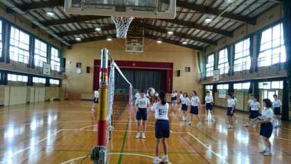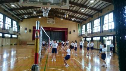 3年生体育では球技(バレーボール)の授業に取り組んでいます。今日はサーブに続いて、スパイク(アタック)の練習です。先生からスパイクの打ち方を教わった後、各自が協力して練習します。トスされたボールの高さにあわせてジャンプ→スパイクするのですが、タイミングを合わせるのが難しいですね。繰り返し練習し、コツをつかんでくださいね。