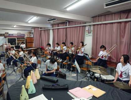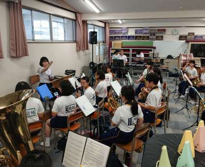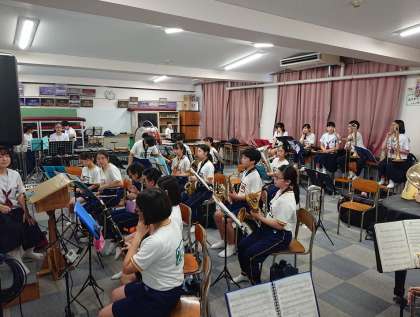 午前中の練習は、わかれてパート練習からはじまりました。音楽室に集まっての学校は、卒業生の力も借りながら、緊迫感ある演奏です。