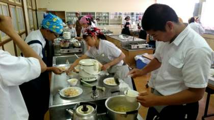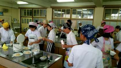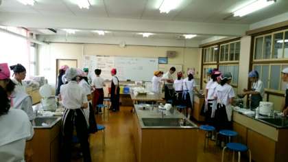 2年生家庭科で調理実習を行っています。今回のメニューは「ハムピラフ」と「卵スープ」。みんなで洋食に挑戦します。ピラフ作りでは、ハムなどの具材を切ってコンソメ味に仕上げます。グループ毎に協力し、美味しく出来上がりました。さっそくみんなでいただきましょう!