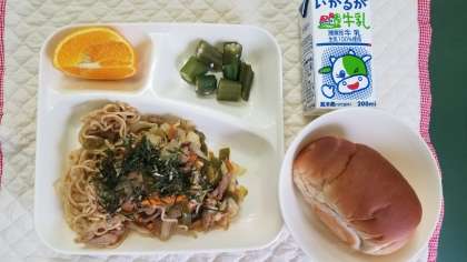 本日の献立は、焼きそば、オクラのかつお梅風味、オレンジ、黒糖パン1/2、牛乳です。