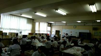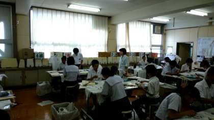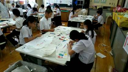 1年生家庭科で「ステンシルTシャツ」を制作しています。染色(ステンシル)の手法を活用し、真っ白なTシャツに好きなデザインを描き、染めていきます。自分の名前や可愛いキャラクタ−、部活動に関するロゴなど、それぞれ工夫がみられます。素敵な作品に仕上げてくださいね。真夏の青空に、純白のTシャツが映えそうです!