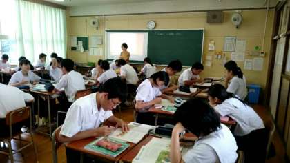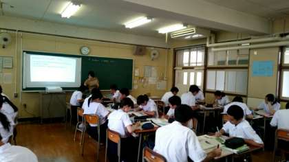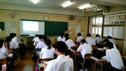 3年英語科で「英文読解」の授業を行っています。各自、英文を読み取っていくのですが、今回は2名づつ机をくっつけ、互いに教えあいながら学習を進めます。わからない点を出し合いながら、互いに学びあう授業スタイルもステキですね。