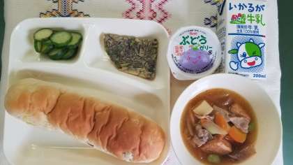 本日の献立は、もずく入りヒラヤーチー、豚肉といかの煮もの、あっさりきゅうり、ぶどうゼリー、おさつパン、牛乳です。