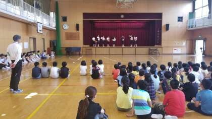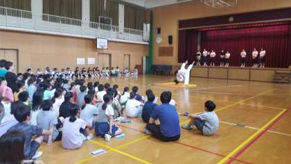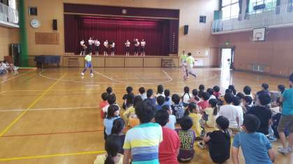 サッカー部、男子バスケットボール部、野球部、女子バスケットボール部、柔道部、吹奏楽部の代表生徒たちが、それぞれの部活動の紹介と実演をしました。