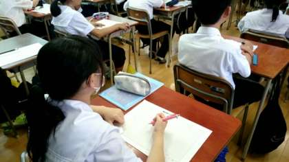 1年生技術科で「製図」の授業を行っています。方眼紙を使って「キャビネット(飾り棚)」の等角図を作成します。書画カメラを使って、作図のようすを実際に投影し、先生が描き方の注意点を説明します。どのように作業するかが映し出されるので、より理解しやすいですね。