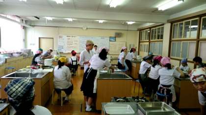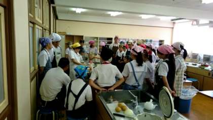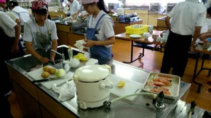 2年生家庭科で調理実習を行いました。今学期最後の実習です。今回のメニューは「鮭のムニエル・粉ふきいも・スープ」です。鮭の切り身に下味をつけたり、じゃがいもの皮をむいたり、皆さん、下ごしらえに一所懸命。先生からのご指導をよく聞いて、美味しく仕上げてくださいね!