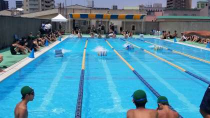 第1泳者は、ビート板10枚でバタ足で泳ぐ。
