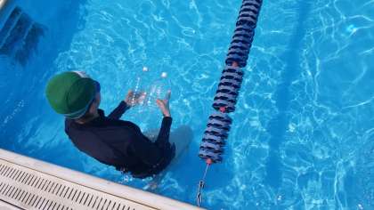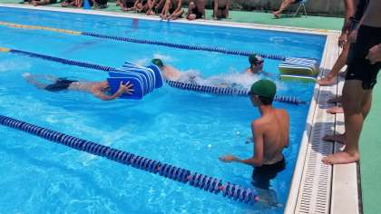 第2泳者は、水が入った2Lペットボトル2本を持ちながら泳ぐ。