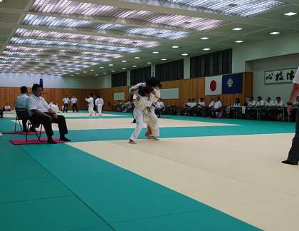 女子団体の2回戦は、寝屋川第二中学校と対戦です。高津は先鋒戦、技ありのポイントを取るも後半攻めきれず、相手に投げられ負け。中堅戦は、最後まで粘り、相手から技ありのポイントを奪い勝ち。大将戦は格上相手に攻めにいくも押さえ込まれ1-2で負けました。
