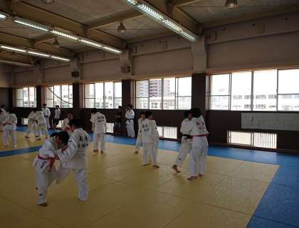 旭東中学校で柔道部は合同練習を行いました。11校80名ほど集まり、この中で1年生も黒帯の先輩に稽古をつけてもらいました。