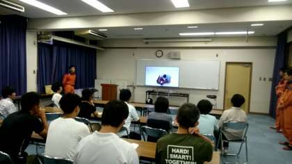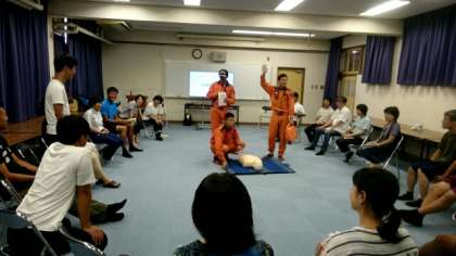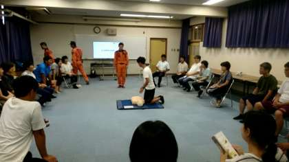 天王寺消防署の方々を招いて「応急手当研修会」を実施しました。目の前で人が倒れ、呼吸や心臓が止まった状態の時、胸骨圧迫(心臓マッサージ)とAED(自動体外式除細動器)による電気ショックが救命のカギとなります。講師の救命士さんから説明を受け、先生方が実際に応急手当の手順を教わります。「いざ」という時に実践できるよう、しっかりマスターしてくださいね。