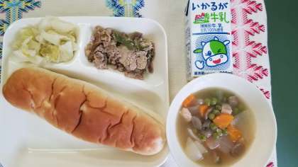 本日の献立は、豚肉のカレー風味焼き、スープ煮、サワーキャベツ、おさつパン、牛乳です。