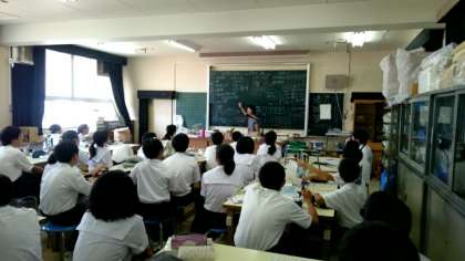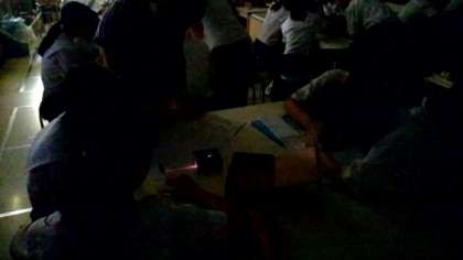1年生の皆さんが理科室で実験を行っています。現在「光の性質」について学習中。今回は「光の反射や屈折」を教わります。光が異なる物質を進む(通過する)とき、その境界で折れ曲がる現象を「光の屈折」というそうです。実験では理科室を真っ暗にして、レンズや鏡を使いながら光が進むようすを確かめました。