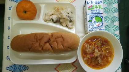 本日の献立は、豆乳マカロニグラタン、トマトスープ、冷凍みかん、黒糖パン、牛乳です。