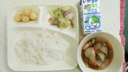 本日の献立は、月見の行事献立でみたらしだんご、鶏肉とさといもの煮物、豚肉とキャベツのいためもの、ごはん、牛乳です。