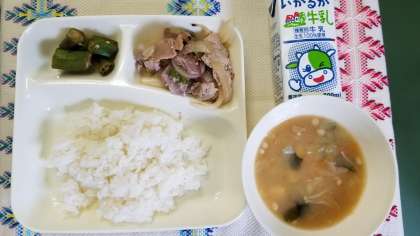 本日の献立は、豚肉の甘辛焼き、オクラのおかかいため、みそ汁、ごはん、牛乳です。