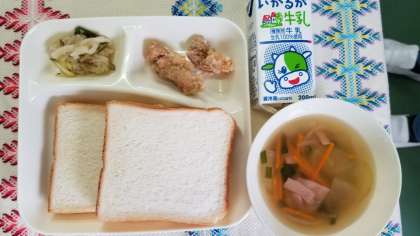 本日の献立は、鶏肉のから揚げ、冬瓜の中華スープ、切り干し大根のごま辛味づけ、食パン2枚、牛乳です。