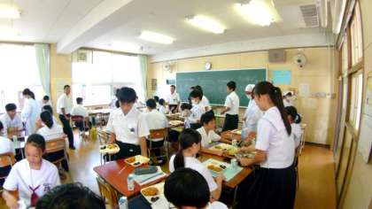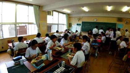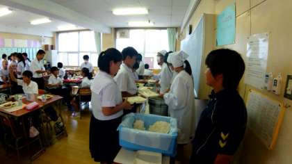 本日の給食は人気のカツカレー。1年生の教室では、係生徒の皆さんがテキパキと配膳をすすめます。クラス全員に給食が行き渡ったら、カレールーの追加希望者が列をつくります。さすが人気メニュー。あっという間に寸胴がからっぽに。さぁ、今日も美味しくいただきましょうね。