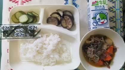 本日の献立は、肉じゃが、焼きなすの味噌だれかけ、あっさりきゅうり、焼きのり、ごはん、牛乳です。
