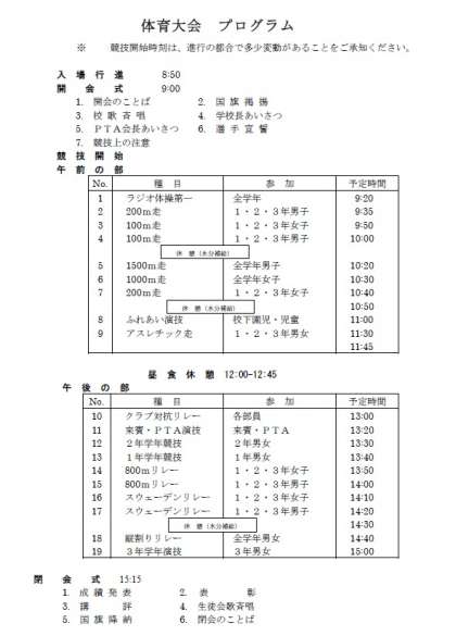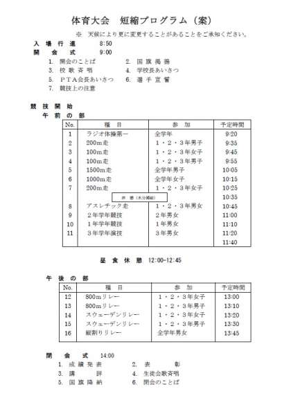 明日の「第68回体育大会」は、天候により、雨天中止や短縮プログラムに変更する場合があります。
