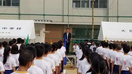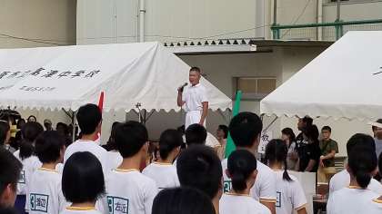 開会式では、開会のことば、国旗掲揚、校歌斉唱、学校長あいさつ、PTA会長あいさつと続きます。