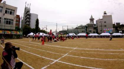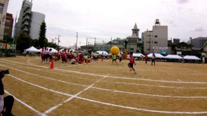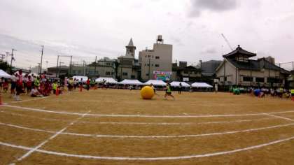2年生に続き1年生学年競技です。大玉運びや2人3脚〜3人4脚、騎馬競争に段ボール箱運びなど、工夫をこらした「クラス対抗 バラエティ・リレー」を行います。1年生らしい可愛らしい競技に、思わず表情がゆるみます。