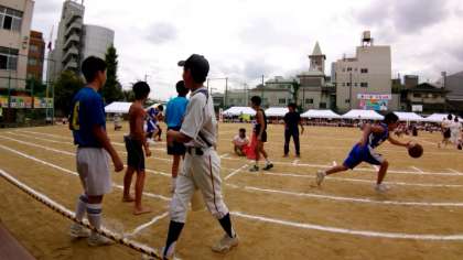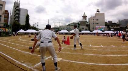 「クラブ対抗リレー」の締めくくりは運動部男子。卓球・サッカー・水泳(男子)・男子バスケットボール・野球部の皆さんが1位を競いあいます。本部席前では、野球部の皆さんのスライディングやサッカー部の皆さんのオーバーヘッドシュートなど豪快なパフォーマンスを披露してくれました。