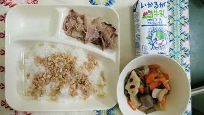 本日の献立は、豚肉のねぎじょうゆ焼き、ふきよせ煮、ツナ大豆そぼろ、ごはん、牛乳です。