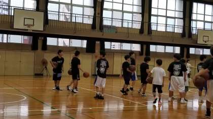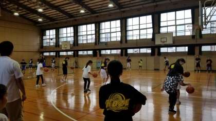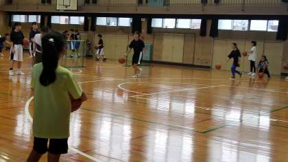 男女のバスケットボールは、それぞれ、ボールを使った基本練習などをしていました。