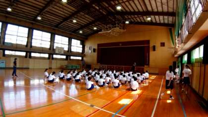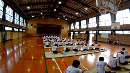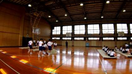 2年生体育で、器械体操(マット運動)が始まりました。男女それぞれが協力し、体育館にマットを敷いていきます。最初はグループ毎に柔軟体操から。先生の号令にあわせてしっかり身体をほぐしましょう。