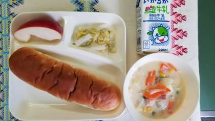 本日の献立は、コーンクリームシチュー、はくさいのピクルス、りんご1/4、おさつパン、牛乳です。