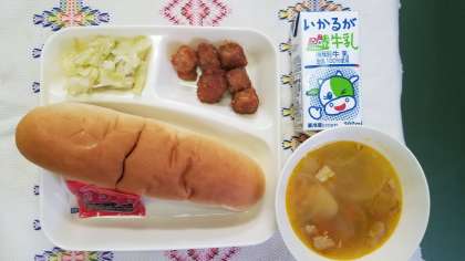 本日の献立は、まぐろのオーロラ煮、ベーコンとじゃがいものスープ、キャベツの柚子ドレッシング、コッペパン、いちごジャム、牛乳です。