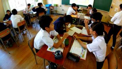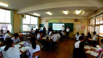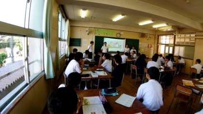 2年生英語科で「暗唱コンテスト」を行っています。クラスを8つのグループに分けて、教科書の会話文を各自が暗唱します。英文をしっかり覚えているか、発音や声の大きさ、表現力などを生徒の皆さん自身がコメントします。各グループがお互いの良い点や課題点を確かめながら、英語力を伸ばしあって欲しいですね。