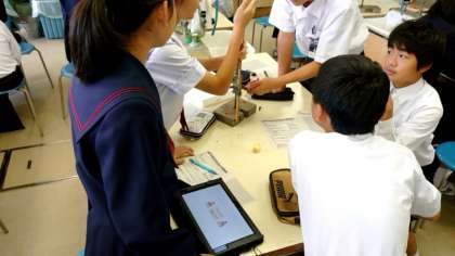 1年生理科の授業で実験を行っています。今日の課題は「力の大きさとバネの伸びの関係」。重りを吊るしたバネの伸びの変化を調べ、測定したデータをタブレットパソコンを使ってグラフ化します。実験機材の準備やパソコン(アプリ)の立ち上げなど役割いっぱいですが、皆さん上手くできましたか?