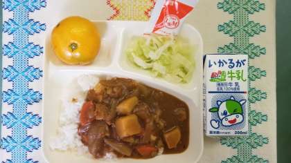 本日の献立は、ポークカレーライス、キャベツのサラダ、みかん、牛乳です。
