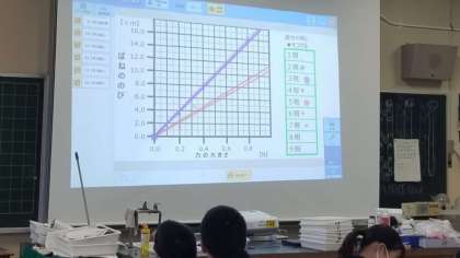 また、タブレットで各班が実験結果を記録したグラフが、前のスクリーンでは全9班のグラフが重なって映し出されています。他の班の結果もすぐに確認することができます。