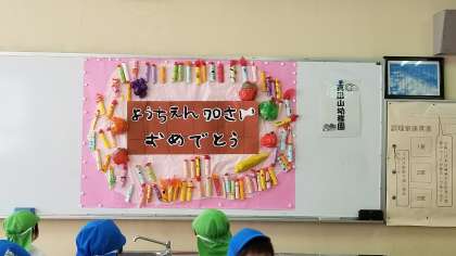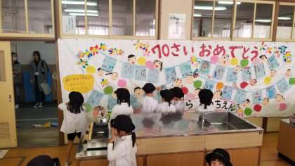 調理室の展示作品です。真田山幼稚園、味原幼稚園の作品です。両幼稚園とも70周年ですね。おめでとうございます。