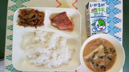 本日の献立は、赤魚のしょうゆだれかけ、みそ汁、きんぴらごぼう、ごはん、牛乳です。
